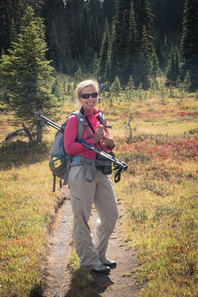 Diane Lynch, we are known as the ladies in Red by the amazing Bronka Sandstrom. I believe she was the original lady in red though because she always had those red pants first. Full of life you are just like her. You follow your dreams and in so many ways you are my mentor on how to do this and that from anywhere from photography to climbing a hill of ice at Paradise. My love extends to you in so many ways. We have shared so many thoughts on the trail. Hiking is really life changing for all of us, as it should be. I remember this day so well because I turned around to take one last view of the patrol cabin, then the expanse of Indian Henry’s, during evening, early fall and Tahoma and then looked at you. This is that moment.