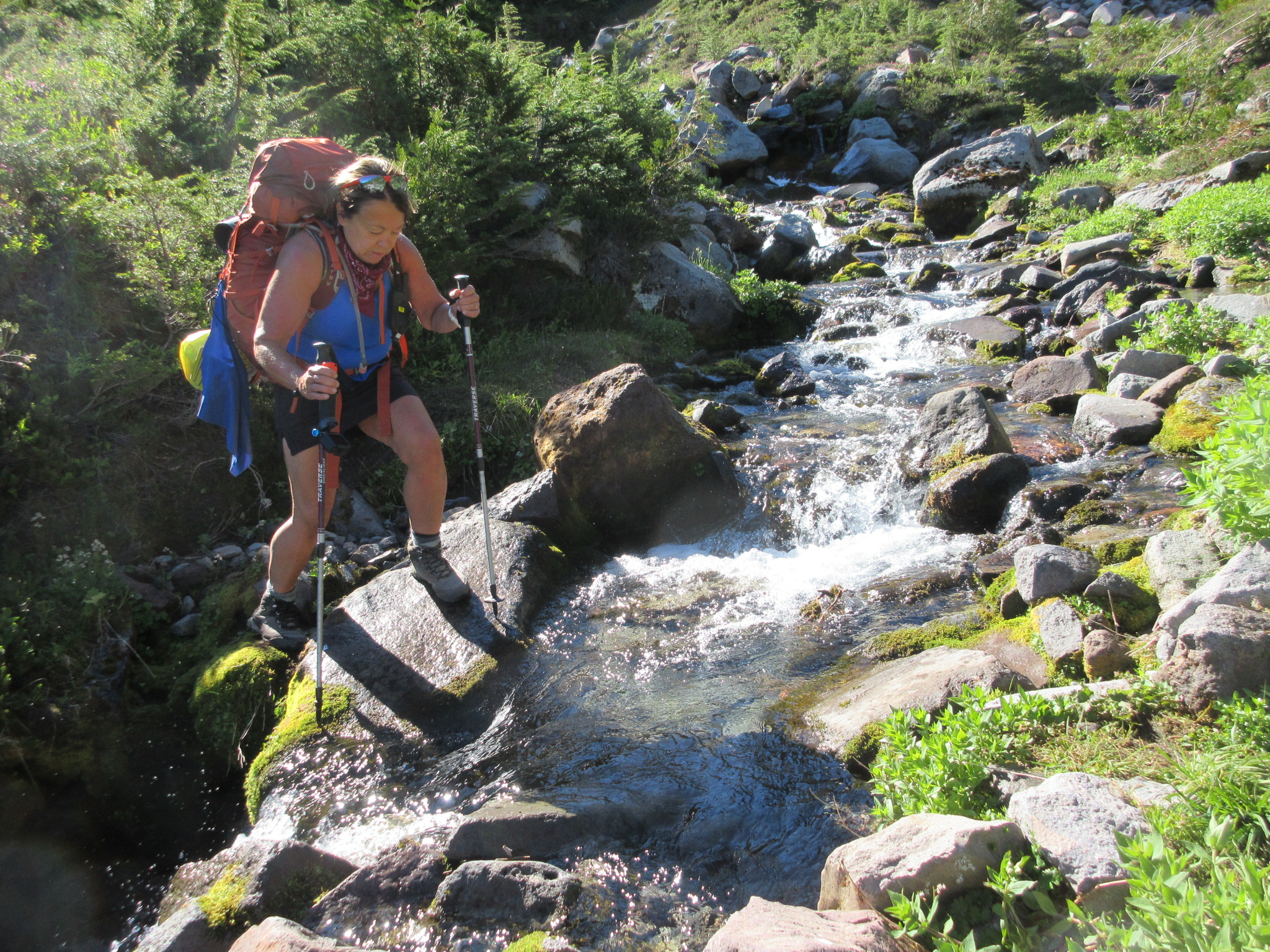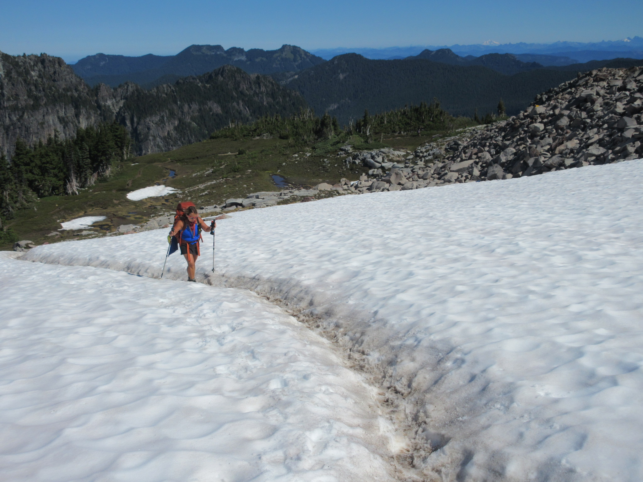 Along our way we are bear aware but mostly we see day hikers at mid day traveling from Mowich Lake. We start to get a lot of questions at this point. Where have we been, how long have we been out here, etc. Our big backpacks are tell tale of our adventure. I notice other tell tale signs, like white lines at the crease at inside of my elbows due to grasping poles and an uneven tan line and my legs look chiseled and sinewy.