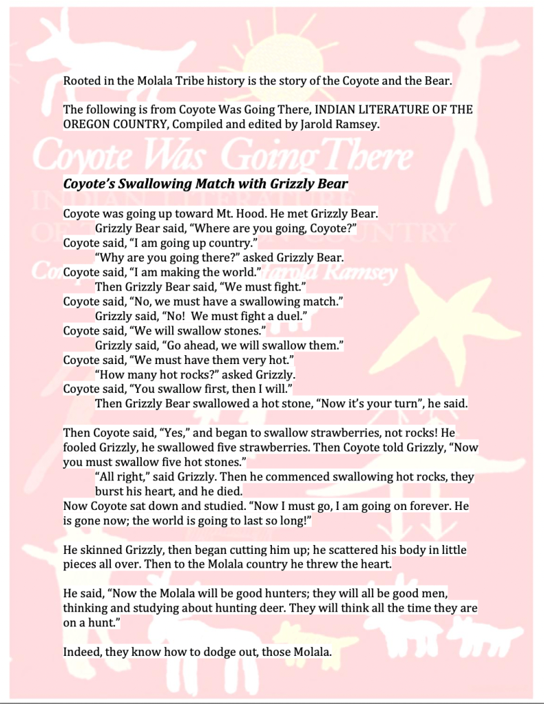 The following Native American story was used to tell about the grizzly bear. It is symbolic with hot rocks being shots and the coyote being an animal that is a trickster, perhaps man.